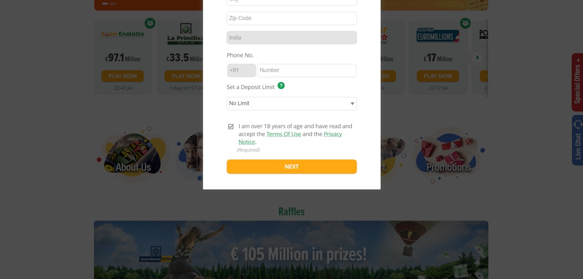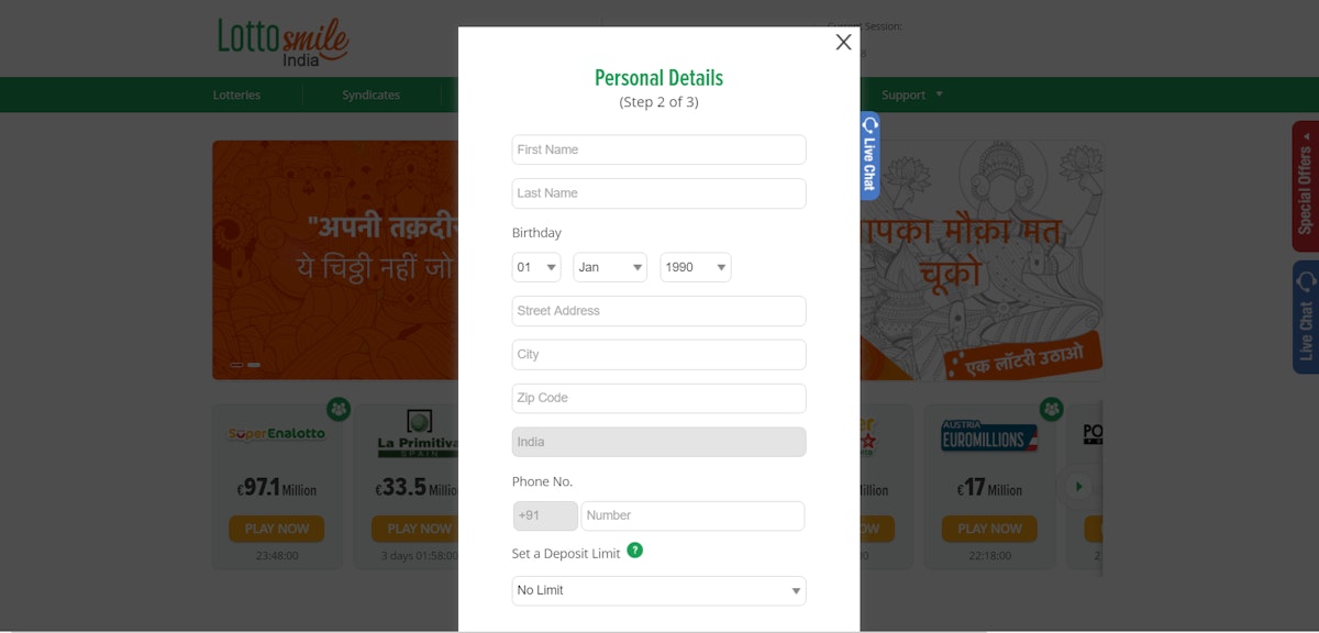 Lottosmile will now ask you for your personal information, which will be verified later (when you wish to withdraw your winnings).